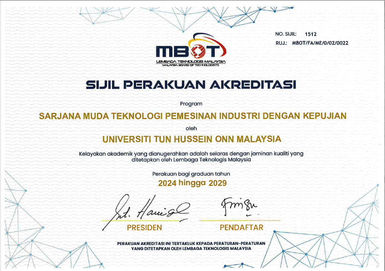 All Bachelor Technology programmes offered by FPTV are accredited by the Malaysian Qualifications Agency (MQA) and compliance with the Malaysian Qualifications Framework (MQF). In addition, our Bachelor of Technology in Industrial Machining with Honours is also accredited by the Malaysia Board of Technology (MBOT).